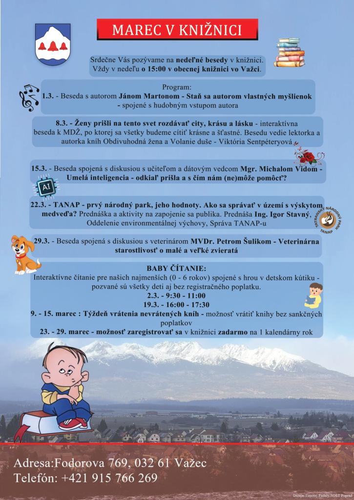 V mesiaci marec sa v knižnici vo Važci uskutočnia viaceré besedy, ktoré sú otvorené pre všetkých. Každú nedeľu o 15:00 sa môžete tešiť na zaujímavých hostí ako Ján Marton, Viktória Sentpéteryová, Mgr. Michal Vid a ďalší. Okrem besied sú pre najmenších pripravené aj interaktívne čítania a týždeň bez sankčných poplatkov za vrátenie kníh. V závere mesiaca bude možnosť zaregistrovať sa v knižnici zadarmo na celý rok, čo je skvelá príležitosť pre všetkých čitateľov.