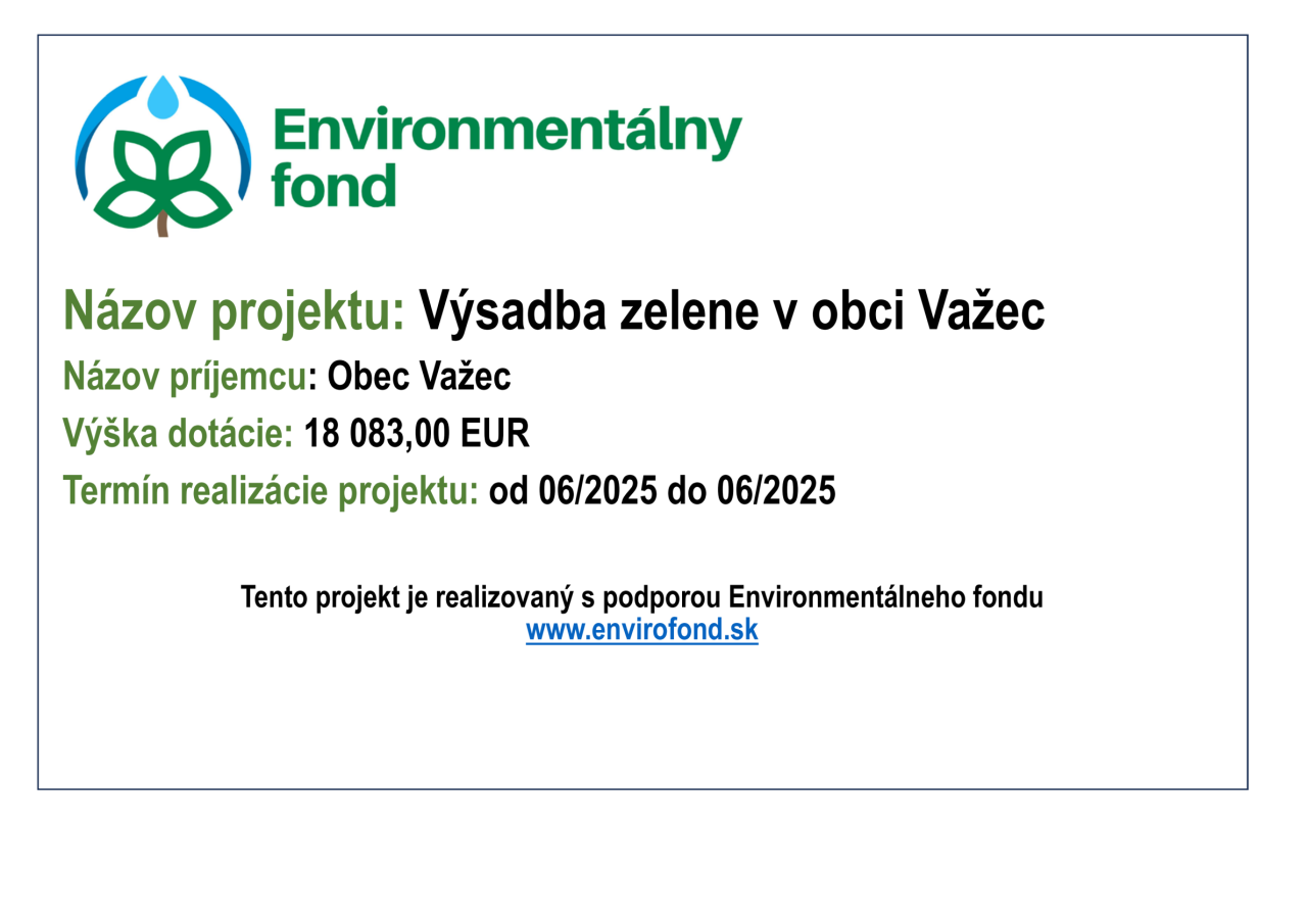 Obec Važec sa teší z podpory Environmentálneho fondu, ktorý prispel sumou 18 083,00 EUR na projekt výsadby zelene. Realizácia tohto projektu je naplánovaná na jún 2025. Cieľom je zlepšiť životné prostredie a podporiť biodiverzitu v obci.